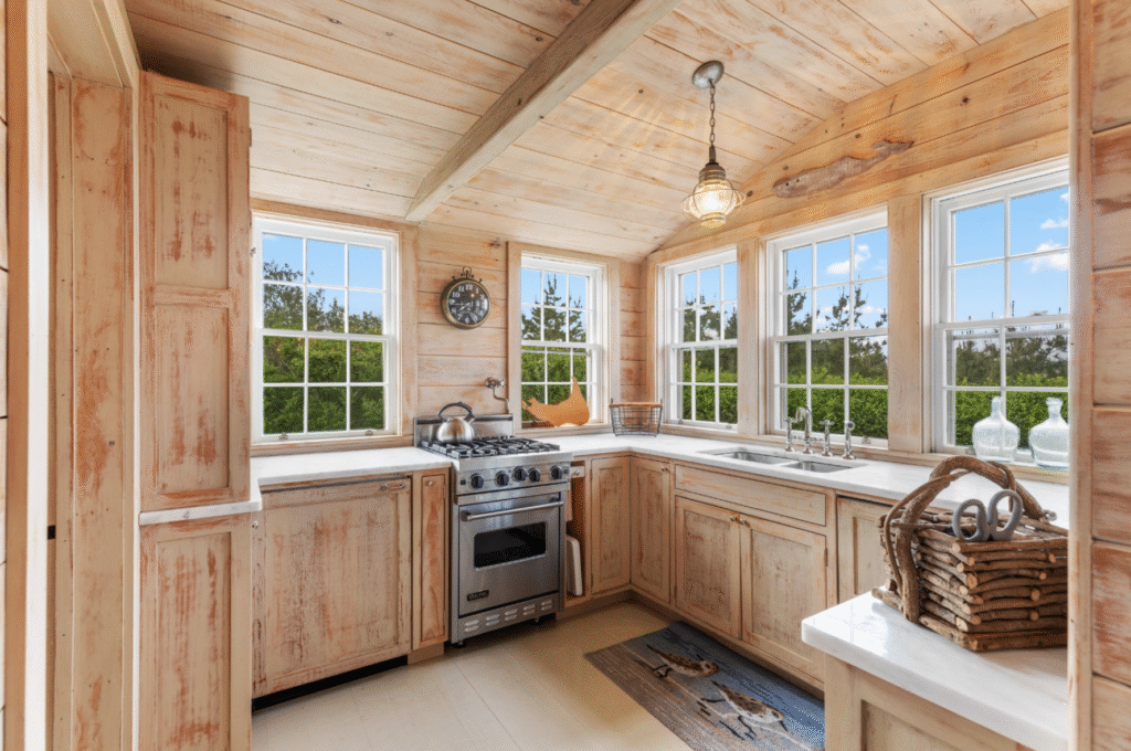 The Siasconset cottage’s appeal lies in its thoughtful design and prime location. A gourmet kitchen, a cozy banquette for dining, and a covered porch with drop-down windows create inviting spaces for entertaining or unwinding to the sound of crashing waves. The primary bedroom offers panoramic ocean views, while a loft with custom bunk beds adds a whimsical touch for guests or family. Recent renovations, including a redone bedroom off the porch and a barn door in the basement, ensure move-in readiness.
